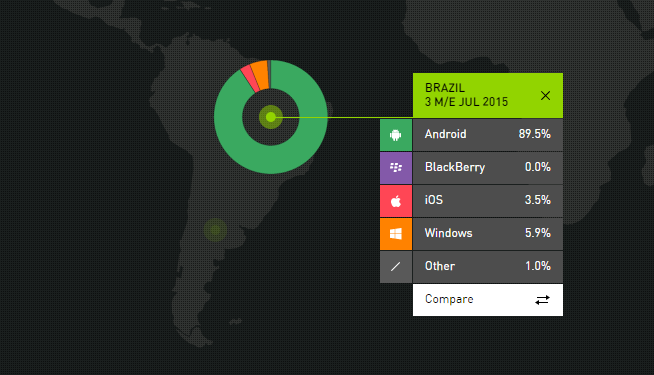 A participação dos dispositivos Android se manteve basicamente a mesma, oscilando na casa dos 89%. A BlackBerry, por sua vez, desapareceu do mercado brasileiro, passando de 0,7% para 0%, segundo o levantamento. Os outros sistemas operacionais somam 1% do total.